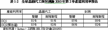 在IC制造業(yè)部分,預(yù)估2010Q2漸步入季節(jié)性需求上升期,配合產(chǎn)能逐步開出,臺(tái)灣IC制造業(yè)可望呈現(xiàn)價(jià)量齊揚(yáng)的階段,帶動(dòng)臺(tái)灣IC制造業(yè)產(chǎn)值上揚(yáng),預(yù)估可較2010Q1成長(zhǎng)6.6%,并較去年同期成長(zhǎng)47.6%