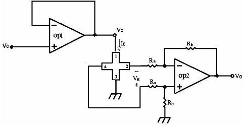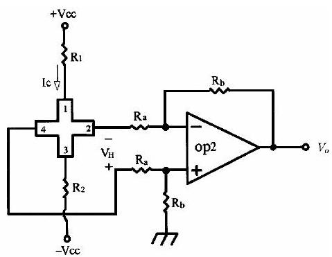 磁場(chǎng)強(qiáng)度可利用形成在結(jié)晶片的一部份的霍爾組件變換成電氣信號(hào)(參照前述霍爾組件的作用原理)。結(jié)晶通常使用半導(dǎo)體硅,霍爾組件的磁場(chǎng)靈敏度為10~20mV/K.Oe。此信號(hào)經(jīng)形成在同一結(jié)晶中的信號(hào)處理電路放大后,作為適合所定目的的信號(hào)電壓被取出。通常四根導(dǎo)線中的兩根連接于一方接地的電源,而從剩下的兩根的一根取出正極性的信號(hào)電壓,并從另一根取出負(fù)極性的信號(hào)電壓?;魻柦M件的輸入電阻通常需符合信號(hào)處理電路的電源,以便可利用定電壓使用霍爾組件。此時(shí)組件的輸出電壓不管在N型或P型均無大差異。又因輸出電壓與電子或正孔的移動(dòng)度成正比,故溫度特性也應(yīng)該盡量保持一定,這是與單體霍爾組件不同的地方。