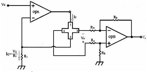 圖2系表示3~5端子之霍爾組件的使用方法,在三端子霍爾元件之輸出可以產(chǎn)生輸入端子電壓之大致一半與輸出信號(hào)電壓之和的電壓,而在四端子及五端子霍爾組件中,在原理上雖然可以免除輸入端子電壓的影響,但實(shí)際上即使在無磁場(chǎng)時(shí),也有起因于組件形狀之不平衡等因素之不平衡電壓存在。