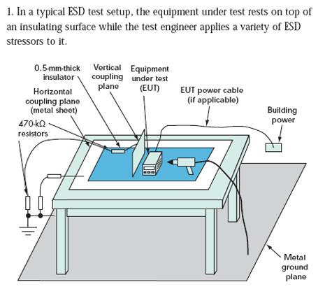 這樣的測(cè)試環(huán)境必然能實(shí)現(xiàn)可重復(fù)的結(jié)果。首先,將被測(cè)設(shè)備(EUT)放在絕緣表面上,然后從不同的方向?qū)UT施加沖擊。例如,給導(dǎo)電表面施加接觸放電,這些表面包括所有金屬外殼和連接器的接地金屬殼。也可以向四周絕緣表面進(jìn)行空氣放電,并將重點(diǎn)放在可能的ESD路徑上,比如設(shè)備外殼中的縫隙以及所有通風(fēng)孔及鍵盤(pán)。