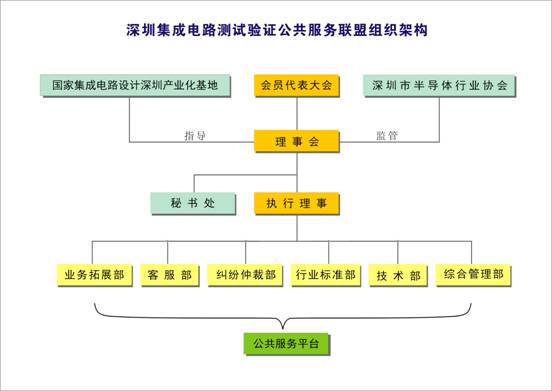 如上圖所示,會員代表大會由IC設(shè)計公司,封裝測試廠,設(shè)備廠商,高校,研究所和電子制造工廠代表組成,是深圳集成電路測試驗證公共服務(wù)聯(lián)盟的最高權(quán)力機構(gòu),下設(shè)理事會,理事會是聯(lián)盟管理的智囊團,各種規(guī)章制度的起草者和重大事務(wù)的決策者,其下又設(shè)執(zhí)行理事和秘書處,執(zhí)行理事負(fù)責(zé)日常事務(wù)的實際運行,是公共服務(wù)聯(lián)盟的操作單位,秘書處主要負(fù)責(zé)會員代表大會的召開以及日常會員事宜的組織,執(zhí)行理事又下設(shè)業(yè)務(wù)拓展部、客服部、糾紛仲裁部、行業(yè)標(biāo)準(zhǔn)部、技術(shù)部和綜合管理部。