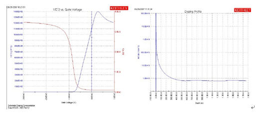 圖5.利用吉時利4200-SCS進(jìn)行參數(shù)提取的實例表現(xiàn)了半導(dǎo)體的摻雜特征(左邊的藍(lán)線),它與1/C2與Vg的關(guān)系呈倒數(shù)關(guān)系(紅線)。右圖給出了摻雜分布,即每立方厘米的載流子數(shù)與襯底深度的函數(shù)關(guān)系。
