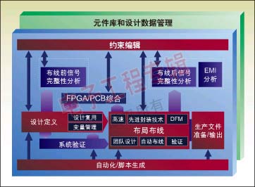圖1表明了一個(gè)典型的由前端到后端的綜合系統(tǒng)設(shè)計(jì)。它始于設(shè)計(jì)定義(原理圖輸入),該設(shè)計(jì)定義與約束編輯緊密集合在一起。在約束編輯中,設(shè)計(jì)者既可定義物理約束又可定義電氣約束。電氣約束將為網(wǎng)絡(luò)驗(yàn)證驅(qū)動(dòng)仿真器進(jìn)行布局前和布局后分析。仔細(xì)看看設(shè)計(jì)定義,它還與FPGA/PCB集成相鏈接。FPGA/PCB集成的目的是為了提供雙向集成、數(shù)據(jù)管理和在FPGA與PCB之間執(zhí)行協(xié)同設(shè)計(jì)的能力。