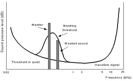 它們使用了三大關(guān)鍵技術(shù)。當(dāng)要剔除低于最小聽(tīng)覺(jué)閾值的聲音時(shí),使用頻率屏蔽技術(shù)。當(dāng)一個(gè)大幅度信號(hào)非常接近另一個(gè)較低幅度的信號(hào)時(shí),使用幅度屏蔽技術(shù)。從而小信號(hào)被大信號(hào)屏蔽,因此小信號(hào)將不被編碼。最后,當(dāng)不同音調(diào)在時(shí)間上非常接近時(shí),使用時(shí)間屏蔽技術(shù)。從而可屏蔽掉在一個(gè)較柔和聲音前或后的高音,并把它丟棄掉。
