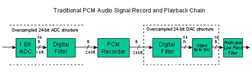 數(shù)字音頻的最常見(jiàn)數(shù)據(jù)格式是脈沖編碼調(diào)制(PCM)。CD使用以44.1kHz采樣頻率錄制的16位PCM數(shù)據(jù),DVD-Audio盤(pán)也使用PCM數(shù)據(jù)格式,因此用來(lái)處理DVD-Audio數(shù)據(jù)的技術(shù)與CD是一樣的。典型的系統(tǒng)架構(gòu)如下圖所示。注意:在sigma-deltaDAC之前,有一個(gè)數(shù)字濾波器用來(lái)處理過(guò)采樣和防止圖像抖動(dòng)。