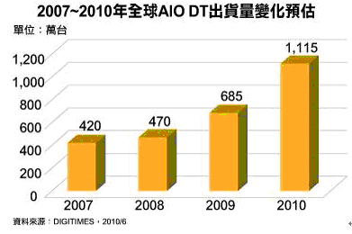 平價(jià)一體式桌上型計(jì)算機(jī)(All In One PC;AIO PC)在2009年創(chuàng)下685萬臺(tái),成長(zhǎng)45.7%后,DIGITIMES Research預(yù)估2010年將進(jìn)一步提高至1,115萬臺(tái),成長(zhǎng)62.8%,展現(xiàn)新興產(chǎn)品的強(qiáng)勁成長(zhǎng)力道。