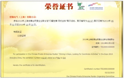 在2010世博會開幕之際,密勒電氣(上海)有限公司通過世博會企業(yè)聯合館“閃耀世博 尋找坐標”官方審核,名字被刻入館內水晶展示墻,充分體現了密勒的積累百年的實力和影響力。