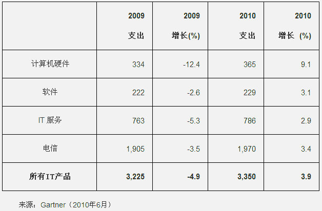 Gartner最新的研究報告指出,2010年全球IT支出預(yù)計將達3.35萬億美元,與2009年的3.22萬億美元的IT支出相比,增長為3.9%。不過,由于歐元對美元的貶值,Gartner已經(jīng)調(diào)低了今年第一季度所做的2010年全球IT支出預(yù)計將增長5.3%的預(yù)測。