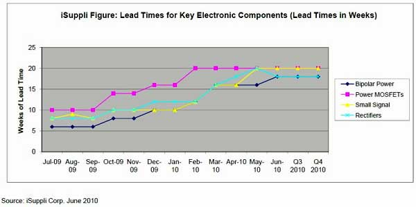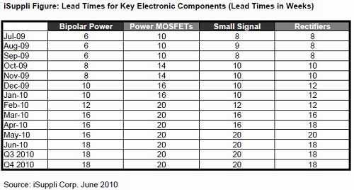 iSuppli指出,整體市場的交貨期比一個(gè)月以前所預(yù)期的拉長很多;例如功率 MOSFET 與小型訊號(hào)晶體管的交貨期在6月時(shí)約20周,雙極功率組件(bipolar Power devices)與整流器的交貨期則為18周;而在正常情況下,這些零組件的交貨期應(yīng)該是10~12周。