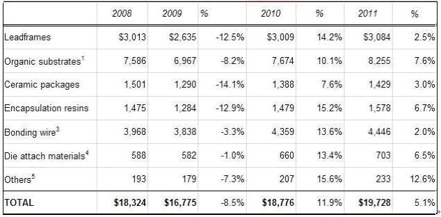 預測2011年封裝材料將下降到個位數(shù)的增長, 雖然其它others類包括如硅片級封裝WLP的介質(zhì)材料及焊球, 它們的增長率都在低的兩位數(shù)。注意到鍵合線在2011年減緩, 看到幾乎很少有的2%增長, 但還是比引線框架leadframes多(盡管leadframes出貨量己經(jīng)超過下降周期之前水平)