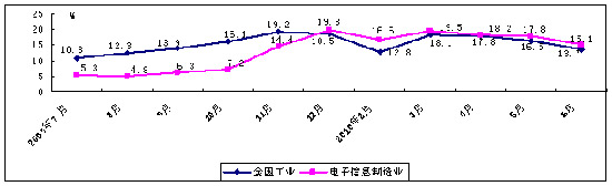 圖1 2009年7月至今規(guī)模以上電子信息制造業(yè)與全國工業(yè)增加值增速對(duì)比