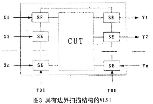 邊界掃描的基本思想是在靠近待測(cè)器件的每一個(gè)輸入/輸出管腳處增加一個(gè)邊緣掃描單元,并把這些單元連接成掃描鏈,運(yùn)用掃描測(cè)試原理觀察并控制待測(cè)器件邊界的信號(hào)。在圖3中,與輸入節(jié)點(diǎn)X1,X2…、Xm和輸出節(jié)點(diǎn)Y1,Y2…、Ym連接的SE即為邊界掃描單元,它們構(gòu)成一條掃描鏈(稱為邊界掃描寄存器一BSR),其輸入為TDI(TestDataInput),輸出TD0(TestData0ut)。在測(cè)試時(shí)由BSR串行地存儲(chǔ)和讀出測(cè)試數(shù)據(jù)。此外,還需要兩個(gè)測(cè)試控制信號(hào):測(cè)試方式選擇(TestModeSelect—TMS)和測(cè)試時(shí)鐘(TestC1ock—TCK)來(lái)控制測(cè)試方式的選擇。