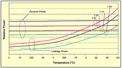 如圖1所示,功耗很大程度上取決于電源電壓和溫度。降低FPGA電源電壓可使動(dòng)態(tài)功耗呈二次函數(shù)下降,漏電功耗呈指數(shù)下降。升高溫度可導(dǎo)致漏電功耗呈指數(shù)上升。例如,把溫度從85℃升高至100℃可使漏電功耗增加25%。