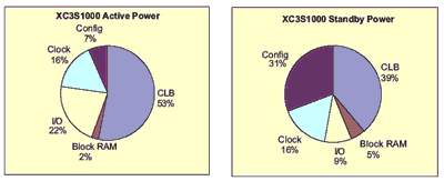 圖2所示為XC3S1000的活動(dòng)功耗和待機(jī)功耗分解圖。據(jù)報(bào)告顯示,活動(dòng)功耗是設(shè)計(jì)在高溫下活動(dòng)時(shí)的功耗,包括動(dòng)態(tài)和靜態(tài)功耗兩部分。待機(jī)功耗是設(shè)計(jì)空閑時(shí)的功耗,由額定溫度下的靜態(tài)功耗組成。CLB在活動(dòng)功耗和待機(jī)功耗中占最主要部分,這不足為奇,但其他模塊也產(chǎn)生可觀的功耗。I/O和時(shí)鐘電路占全部活動(dòng)功耗的1/3,如果使用高功耗的I/O標(biāo)準(zhǔn),其功耗還會(huì)更高。[page]