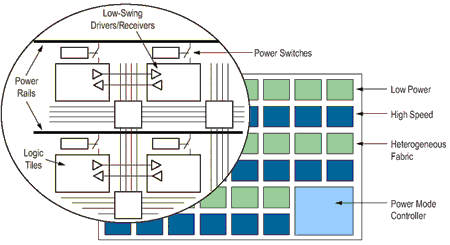 圖3所示為具有上述某些概念的FPGA架構(gòu),其可編程異構(gòu)架構(gòu)由高速度和低功耗兩個(gè)區(qū)組成。一個(gè)片上功耗模式控制器可管理各種降功耗模式,即深睡眠模式、懸掛模式和休眠模式。在架構(gòu)內(nèi)部,可以用專用的供電開關(guān)關(guān)掉每個(gè)邏輯塊的電源。通過布線架構(gòu)的通信信號流經(jīng)低擺幅驅(qū)動(dòng)器和接收器,以降低互連功耗。