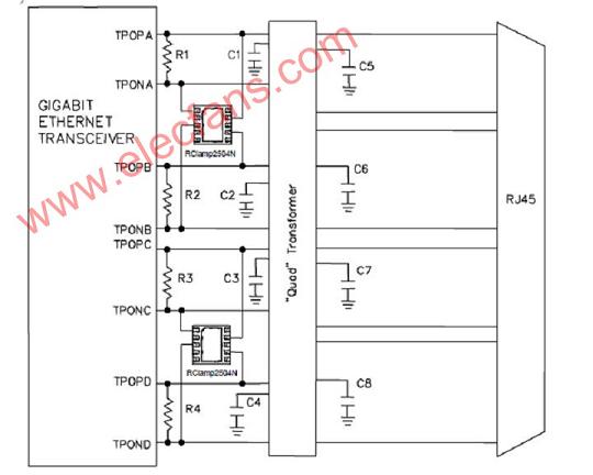 Semtech公司的RClamp2504N/3304N已被成功地應(yīng)用在電腦的RJ45連接器里,它具有較低的鉗位電壓,電容和工作電壓,這樣可以保護(hù)一些敏感的物理層的芯片。該解決方案將非常好,成本低,加上好的RJ45連接器結(jié)構(gòu)和PCB設(shè)計(jì)給線(xiàn)對(duì)地保護(hù)。
