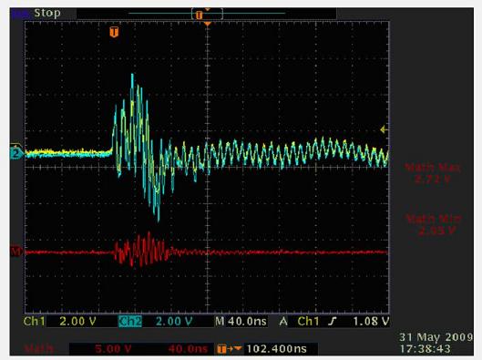 基本上,由于客戶(hù)有好的連接器結(jié)構(gòu)和PCB設(shè)計(jì),當(dāng)雷擊發(fā)生時(shí),它能通過(guò)結(jié)構(gòu)和PCB設(shè)計(jì)釋放,從這個(gè)+6KV雷擊測(cè)試結(jié)果看,我們發(fā)現(xiàn)波形看起來(lái)像振鈴,在PHY端鉗位電壓非常低,這說(shuō)明大部分雷擊能量已被釋放,這時(shí)能很好的保護(hù)PHY芯片。