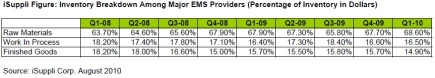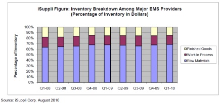 iSuppli指出,觀察全球前五大電子制造服務(wù)(EMS)的最新庫存狀況顯示,在2010年第一季,零組件與原材料占據(jù)近七成的總庫存量;相對來看,在制品(work-in-process goods)占據(jù)總庫存量的比例為17%,成品(finished goods)所占比例則低于15%。