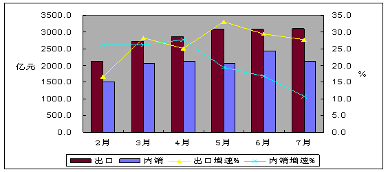 圖2 2010年前7個月出口與內(nèi)銷增速對比