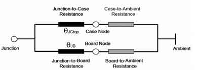 這樣就可以根據公式RJX=(TJ-TX)/Ploss求出結點到環(huán)境的熱阻RthJA(RthJA=RthJS+RthSA)。有關RthJA的計算,這里只介紹一種簡單的熱模型(Compactthermalmodel)2R模型,即Two-ResistorModel。其理論依據如圖4所示。