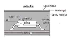 圖5中陰影部分為硅膠、樹脂等灌封料,其作用主要有兩個:一方面用于固定半成品;另一方面用于傳導功率器件表面的溫度(散熱)。所以從結點到環(huán)境的熱阻RthJA就可以表示為: