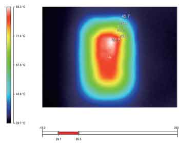 圖6~9是利用Ti20拍攝的金升陽公司12W產品的熱圖像。通過這些圖片,我們不僅可以清晰地看出整體的熱分布(相同的溫度,所用的顏色是一致的),還可以借助其提供的軟件分析每一個元器件此時對應的溫度值,如幾個溫度相對較高的元器件的溫度值分別如表1所示。