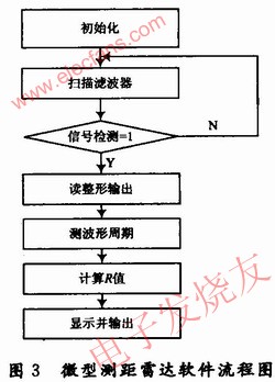 雷達工作時,單片機控制窄帶濾波器不斷的進行掃描,當某一個濾波器有信號時,由可重觸發(fā)單穩(wěn)態(tài)電路組成的信號檢測電路輸出由“0”變?yōu)?ldquo;1”,單片機根據(jù)輸出的窄帶濾波器獲得帶內(nèi)頻率,判斷出精度不太高的距離范圍,利用放大整形輸出進行計數(shù)或測量脈沖的周期,獲得足夠精確的頻率值,即為準確距離。根據(jù)公式計算出R和V送顯示器予以顯示,或通過RS232串口送上一級的計算機系統(tǒng)。