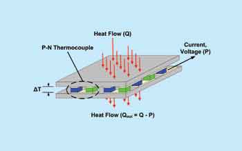 熱電器件的核心組件是一組熱電偶,它包括一個N型與一個P型半導(dǎo)體,兩者由金屬板相連。在P與N型材料對端的導(dǎo)電連接構(gòu)成了一個完整電路。