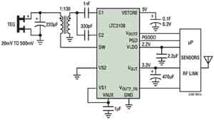 圖2所示電路運(yùn)用一個小型升壓型變壓器來提高LTC3108輸入電壓源輸入的電壓,而LTC3108為無線檢測和數(shù)據(jù)采集提供一個完整的電源管理解決方案。
