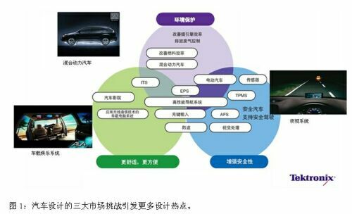 然而,面對日益復(fù)雜的汽車設(shè)計(jì)需求,特別是要推出中高端和商用的新能源汽車之時(shí),自主創(chuàng)新和開發(fā)之路并非坦途。泰克科技的專家曾在不久前舉辦的一場汽車電子技術(shù)論壇上以擁有“100多個(gè)ECU、軟件代碼已經(jīng)達(dá)到700萬行”的豐田L(fēng)exus460汽車為例,強(qiáng)調(diào)了電子部件在汽車特別是高端汽車中所占據(jù)的比例越來越高。“如圖1,汽車電子關(guān)乎目前汽車設(shè)計(jì)的三大市場挑戰(zhàn),即如何滿足生態(tài)(環(huán)境保護(hù))、更舒適方便和增強(qiáng)安全性的要求,而圍繞解決這些挑戰(zhàn)的系統(tǒng)和子系統(tǒng)正是目前汽車電子設(shè)計(jì)的熱點(diǎn)和難點(diǎn)。”他指出。“而局域網(wǎng)、動力系統(tǒng)、電子控制單元和數(shù)字RFID的應(yīng)用在改善汽車生態(tài)學(xué)、安全性和舒適性方面扮演了重要的角色。