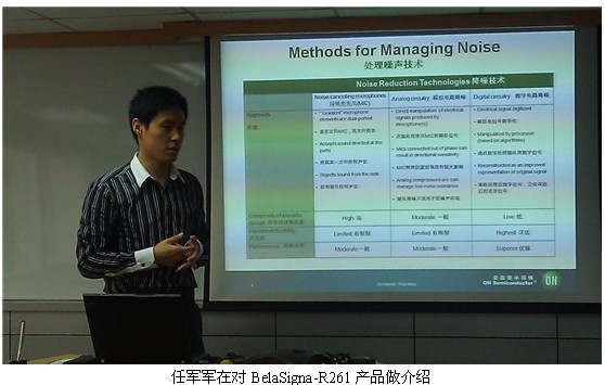 生活在都市的人們通常會(huì)在嘈雜的環(huán)境中撥打或接聽電話,人們總是希望能夠像在田野中一般獲得清晰并且沒(méi)有失真的聲音。對(duì)于手機(jī)廠商來(lái)講,采用能夠清晰拾取語(yǔ)音并抑制噪聲的解決方案是關(guān)鍵。為了應(yīng)對(duì)上述挑戰(zhàn),安森美半導(dǎo)體推出了高性能語(yǔ)音捕獲SoC方案BelaSigna-R261。安森美半導(dǎo)體音頻與助聽器中國(guó)市場(chǎng)開發(fā)經(jīng)理任軍軍在日前的產(chǎn)品發(fā)布會(huì)上對(duì)BelaSigna-R261的特性做了介紹,并現(xiàn)場(chǎng)對(duì)產(chǎn)品進(jìn)行了演示。