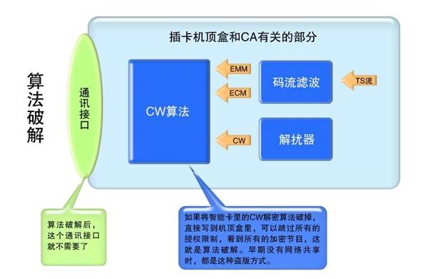 圖六是傳統(tǒng)CA的破解步驟,只要解加密的CW算法被攻破,整個(gè)CA就算完了,就可以在此基礎(chǔ)上完成圖二中的算法破解和圖四、圖五中的網(wǎng)絡(luò)共享。