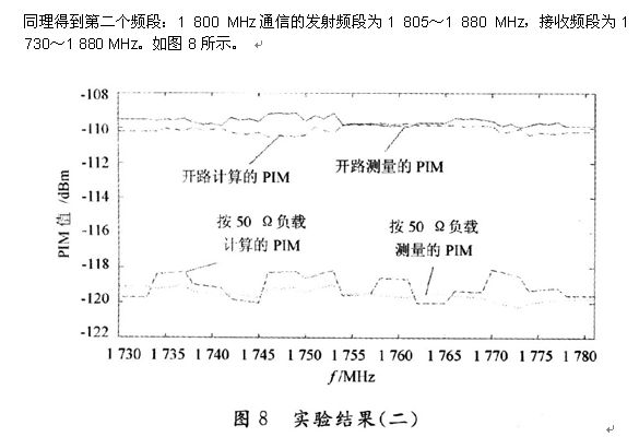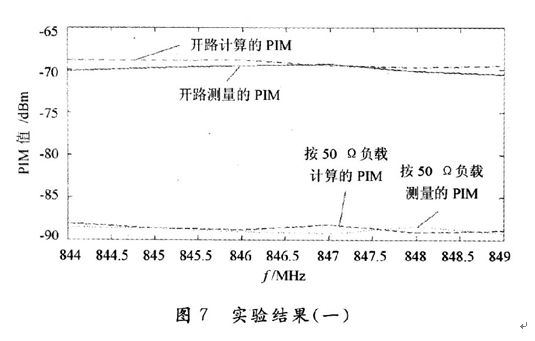 為了驗證該方法的有效性,本文給出了兩個頻段的PIM值的計算與測量結(jié)果對比。頻段l:800 MHz的通信系統(tǒng)的發(fā)射頻段為869~894 MHz,接收頻段為824~849 MHz。如圖7所示。