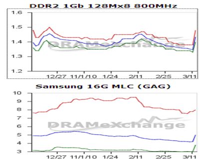 從DDR3來(lái)看,市場(chǎng)已經(jīng)聞風(fēng)而動(dòng),顆粒價(jià)格有明顯上升的勢(shì)頭,尤其是金士頓內(nèi)存(見(jiàn)下表),未來(lái)一段時(shí)間內(nèi)價(jià)格有可能繼續(xù)上揚(yáng)。一些經(jīng)銷(xiāo)商預(yù)計(jì)閃存價(jià)格地震后將出現(xiàn)15%以上的漲幅,已經(jīng)開(kāi)始小幅提價(jià),并出現(xiàn)了惜售的心態(tài)。目前甚至不排除部分經(jīng)銷(xiāo)商囤貨了。