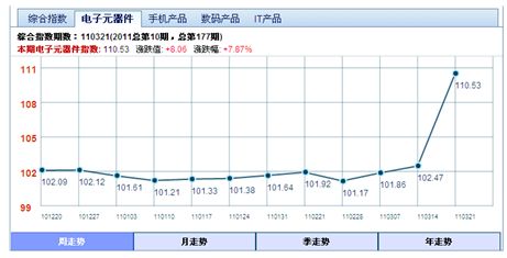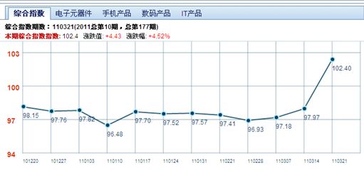 需要特別指出的是,四大成分指數(shù)之一的電子元器件指數(shù)的漲幅最為明顯,本期指數(shù)從3月14日的102.47點(diǎn),漲到了110.53點(diǎn),漲幅為7.87%,也是3年來(lái)之最??磥?lái),日本地震對(duì)華強(qiáng)北指數(shù)的影響也是達(dá)到了峰值,也充分說(shuō)明,華強(qiáng)北電子元器件市場(chǎng)已經(jīng)受到了日本地震的強(qiáng)烈沖擊。