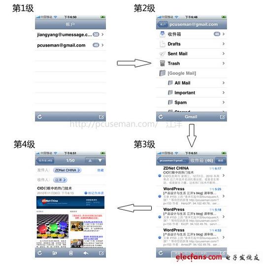 ②對確認的功能結(jié)構(gòu)考慮在iPhone上的信息架構(gòu)模型。上文說過,iPhone應(yīng)用是線性的連貫操作,一層一層進入直到完成最后的任務(wù),所以你要按這個思路去整理信息架構(gòu),一般來說,操作的深度不要超過3層,如果超過3層就要對產(chǎn)品形態(tài)進行扁平化處理,即由深度改為廣度,因為隨著深度的增加,每一級別都會有不同的功能,甚至有承載上一級的功能或邏輯,深度越多,這些功能就會越復(fù)雜,而在手機如此小的空間上就很難進行合理組織。