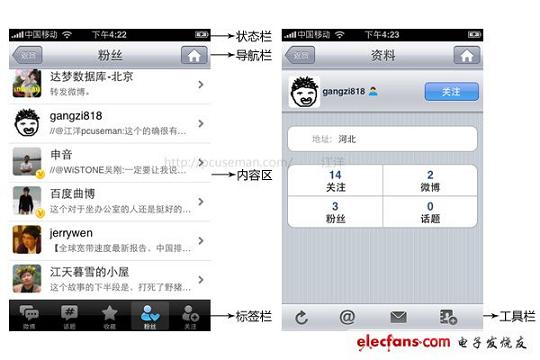 首先iPhone只有一個物理按鍵Home,而這個按鈕主要是在系統(tǒng)級操作上起到一些作用,在一個應(yīng)用中,絕大多數(shù)情況都是退出功能。在480x320這個對手機而言很大的屏幕上要包括以下3個模塊,才能對一個App進行操作。