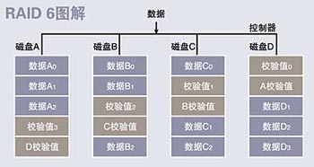RAID-6的全稱是“IndependentDatadiskswithtwoindependentdistributedparityschemes(帶有兩個(gè)獨(dú)立分布式校驗(yàn)方案的獨(dú)立數(shù)據(jù)磁盤)”。RAID6與RAID5的不同之處于除了每個(gè)磁盤上都有同級(jí)數(shù)據(jù)校驗(yàn)區(qū)外,還有一個(gè)針對(duì)每個(gè)數(shù)據(jù)塊的校驗(yàn)區(qū)。當(dāng)然,當(dāng)前盤數(shù)據(jù)塊的校驗(yàn)數(shù)據(jù)不可能存在當(dāng)前盤而是交錯(cuò)存儲(chǔ)的,具體形式見圖。