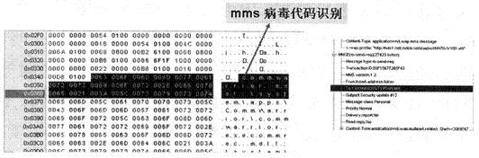 在網(wǎng)絡(luò)運(yùn)行的過程中,我們收到了如下的用戶投訴:“我的手機(jī)出現(xiàn)了1個(gè)奇怪的問題,它總是自動(dòng)隨機(jī)發(fā)送MMS消息給我電話薄中的聯(lián)系人”。有的用戶投訴“收到1個(gè)可疑彩信,由1個(gè)txt文件和1個(gè)可執(zhí)行文件組成。txt文件為‘matrixremoveyou,removematrix’”。經(jīng)過確認(rèn),這些用戶的手機(jī)中了手機(jī)彩信病毒。根據(jù)病毒彩信樣本,顯示該病毒為“CommWarrior.A”病毒。具體病毒特征如圖1所示。