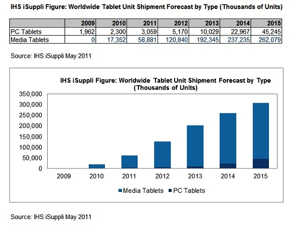 IHS iSuppli估計,在2010年到2015年間,多媒體平板計算機的總出貨量將達到8.887億臺,但同期間PC型平板計算機的出貨量僅有8,880萬臺;在2015年,PC型平板計算機總出貨量預測為4,520萬臺,該數(shù)字在2010年為230萬臺,期間平均年復合成長率(CAGR)為81.5%。但在多媒體平板計算機部分,出貨量在2010年為1,740萬臺,2015年將達到2.621億臺,期間CAGR為17.4%。
