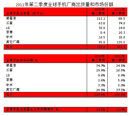 日前,據(jù)Strategy Analytics最新研究顯示,2011年二季度全球手機出貨量比去年同期增長13%,達到3.611億臺。諾基亞出現(xiàn)自1999年以來最大下滑,而蘋果已經接近排名第三的LG。