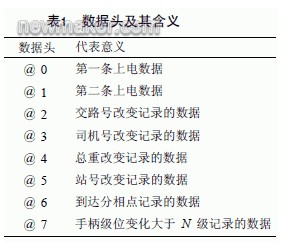 該裝置采用了大容量的存儲(chǔ)器。由于機(jī)車(chē)運(yùn)行的數(shù)據(jù)較多,為了降低GPRS 的使用成本,對(duì)于所有采集的信息均采用非分區(qū)定長(zhǎng)壓縮方法[2]存儲(chǔ),每包數(shù)據(jù)定長(zhǎng)35 個(gè)字節(jié),由數(shù)據(jù)頭、公共數(shù)據(jù)、數(shù)據(jù)幀標(biāo)識(shí)、數(shù)據(jù)校驗(yàn)位等4 部分組成。數(shù)據(jù)頭占一個(gè)字節(jié),公共數(shù)據(jù)占32 個(gè)字節(jié),數(shù)據(jù)幀標(biāo)識(shí)和校驗(yàn)結(jié)果各占一個(gè)字節(jié)。由于每包數(shù)據(jù)只有35 個(gè)字節(jié),不能包含所有的機(jī)車(chē)運(yùn)行信息,因此在上電的時(shí)候?qū)⑼暾囊粭l機(jī)車(chē)運(yùn)行信息拆分成兩包發(fā)送。另外,@7 代表的級(jí)位變化大小N 的值可以在程序中設(shè)定。數(shù)據(jù)頭及其具體含義如表1 所示。