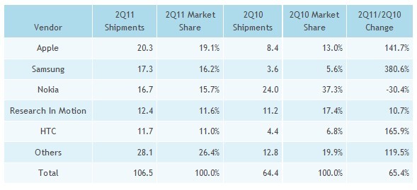 IDC最新市場報(bào)告指出,2011年第二季智能手機(jī)市場表現(xiàn)亮眼,出貨量從去年同期的6440萬支成長至1.065億支,成長了65.4%。而蘋果市占率達(dá)19.1,居市場首位,其后分別是三星、諾基亞、RIM與HTC宏達(dá)電。