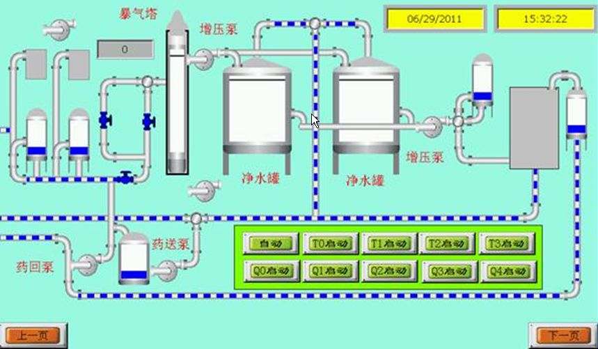 觸摸屏主要功能是顯示和控制制水過(guò)程中的數(shù)據(jù)以及水泵電磁閥的的運(yùn)行狀態(tài)。PLC輸入量有各個(gè)閥門(mén)的開(kāi)閉情況和各罐體的液位情況和壓力情況,其中輸入量中的液位是模擬量輸入;輸出量有水泵的啟動(dòng)停止,電磁閥的開(kāi)閉,報(bào)警等等。圖3為部分觸摸屏的控制界面(初期設(shè)計(jì))。