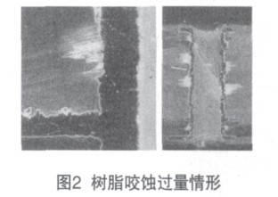 可見,產(chǎn)生CAF必須具備下列五種條件:裸露的銅導(dǎo)體、水氣、電解質(zhì)、電位差和通道。前四項(xiàng)在電子產(chǎn)品的使用中不可避免。通道是唯一可控制產(chǎn)生CAF的途徑,而通道的形成主要與印制板的生產(chǎn)過(guò)程中材料、鉆孔、去沾污等因素相關(guān)。一般地來(lái)說(shuō)材料的玻纖越細(xì),樹脂含量越高,韌性越好,鉆孔撕裂的機(jī)率較低,因此,對(duì)于高密度的印制板或潮濕環(huán)境中使用的印制板盡可能采用細(xì)玻纖的材料。不同的材質(zhì)的鉆頭,不同鉆孔數(shù)量,不同的鉆孔參數(shù),鉆孔時(shí),鉆頭對(duì)增強(qiáng)材料的沖擊不同,孔壁質(zhì)量的差異較大,對(duì)孔壁的損傷也不盡一致,芯吸程度不一。因此,為了杜絕通道的發(fā)生,應(yīng)當(dāng)嚴(yán)格控制鉆孔質(zhì)量,確??妆诠饣秸?。去沾污主要目的是去除內(nèi)層導(dǎo)體鉆孔時(shí)吸附樹脂,當(dāng)然,也咬蝕孔壁絕緣層中的樹脂,有時(shí)為了形成負(fù)凹蝕,孔壁絕緣層樹脂甚至咬蝕更多。這時(shí),咬蝕量需嚴(yán)格控制。否則,極易形成“通道” 。如下圖樹脂咬蝕過(guò)量情形。