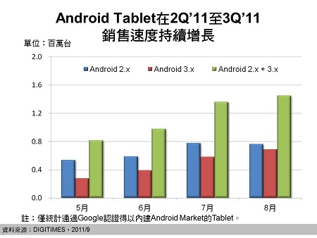 DIGITIMES Research分析師兼項目經(jīng)理林俊吉根據(jù)Google每月公開的連上Android Market 裝置規(guī)格分布比例信息后估算,通過Google認證的Android Tablet月銷售量應已從2011年第二季的不及百萬臺,在8月份邁入近150萬臺的水平。