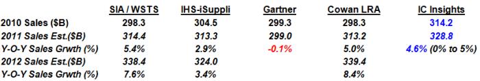 Cowan指出,在這5個(gè)最近發(fā)布的預(yù)測(cè)中,有3個(gè)都認(rèn)為2011年該市場(chǎng)的成長(zhǎng)仍然會(huì)有3,132億~3,134億美元左右; Gartner 較悲觀,預(yù)估為2,990億美元;IC Insights 則樂觀地認(rèn)為會(huì)高于3,280億美元。