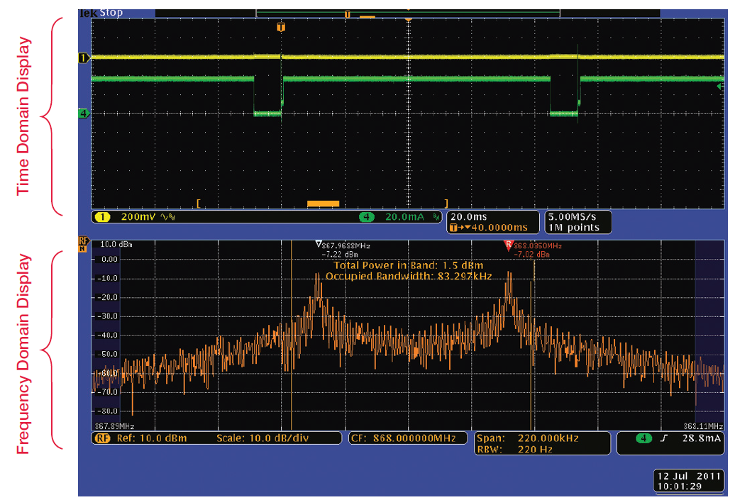 畫面的下半部分顯示了RF信號(hào)的頻域視圖,在本例中是無線電發(fā)射機(jī)輸出,畫面的上半部分是時(shí)域的傳統(tǒng)示波器視圖。頻域視圖中顯示的頻譜來自時(shí)域視圖中短橙色條指明的時(shí)間周期,稱為頻譜時(shí)間(Spectrum Time)。