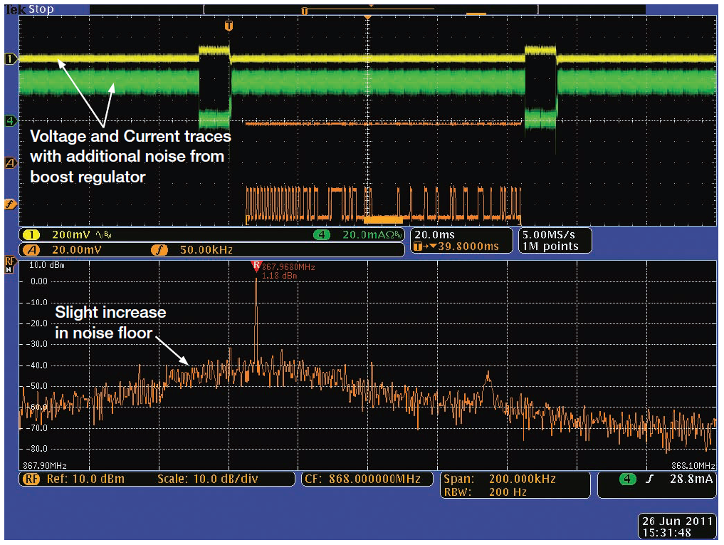 上圖是在使用干凈的實(shí)驗(yàn)室電源供電的模塊中獲得的,這在實(shí)際環(huán)境中很難實(shí)現(xiàn),但可以作用實(shí)用參考。圖4顯示了相同的RF信號(hào),但使用升壓型開關(guān)電源為無線電模塊供電。升壓穩(wěn)壓器因產(chǎn)生噪聲而臭名昭著,但它允許使用一個(gè)或兩個(gè)堿性或鎳鎘單元及相對(duì)較少的器件,降低了成本。注意被調(diào)制信號(hào)底部的噪聲提高。在發(fā)送的信號(hào)附近,噪聲至少要比干凈的電源高5 dB。噪聲已經(jīng)容易地顯現(xiàn)在電流波形和電壓波形中。額外的噪聲還會(huì)令從發(fā)射機(jī)收集這些數(shù)據(jù)所使用的接收機(jī)上的信號(hào)信噪比劣化,降低無線電系統(tǒng)的有效范圍。
