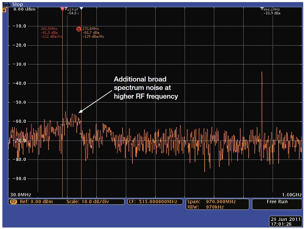 在電源驅(qū)動(dòng)RF電路板時(shí),噪聲功率的時(shí)域畫面和頻域畫面變化。圖6顯示了相同的電源噪聲及額外的信號(hào)。注意二階諧波下降,但有許多其它低電平噪聲。部分噪聲可能會(huì)給無線電接收機(jī)的運(yùn)行帶來很大干擾,需要認(rèn)真評(píng)估。